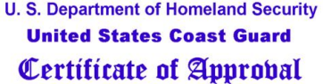 TERMS: The approval of the item described on the face of the Certificate has been based upon the submittal of satisfactory evidence that the item complies with the applicable provisions of the navigation and shipping laws and the applicable regulations in Title 33 and/or Title 46 of the Code of Federal Regulations. The approval is subject to any conditions noted on this Certificate and in the applicable laws and regulations governing the use of the item on vessels subject to Coast Guard inspection or on other vessels and boats.