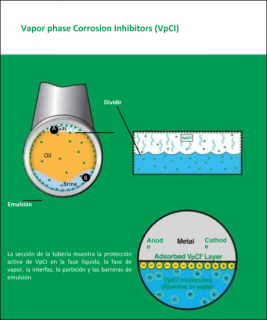La tecnología VpCI, es una opción revolucionaria, ambientalmente segura y rentable para la protección contra la corrosión. Los VpCI forman una unión física en la superficie del metal y crean una capa de barrera para proteger contra iones agresivos. La barrera se recupera y se rellena automáticamente, y se puede combinar con otras propiedades funcionales para obtener capacidades protectoras adicionales. Se puede utilizar en oleoductos, pozos de petróleo y gas, unidades de refinería y combustibles.