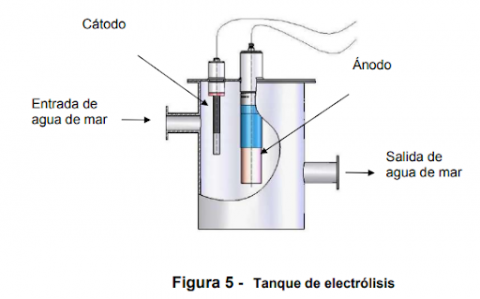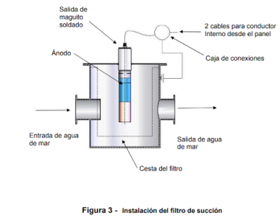 En el caso de un tanque de electrólisis, una fuente de agua de mar con suficiente altura suministra agua a través del tanque donde se la dosifica y se la inyecta en la(s) toma(s) principal(es). La dosificación se calcula obviamente para el caudal total que pasa por las bombas, pero puede estar a una concentración mucho más elevada en el circuito del tanque de electrólisis, a fin de mantener reducido el tamaño de la tubería. Es aceptable un nivel de hasta cien veces la concentración. Instalación de filtros convencional que exhibe un manguito soldado. El manguito puede ser de nailon. Se supone que se trata de un filtro metálico que debe estar conectado a tierra adecuadamente.
